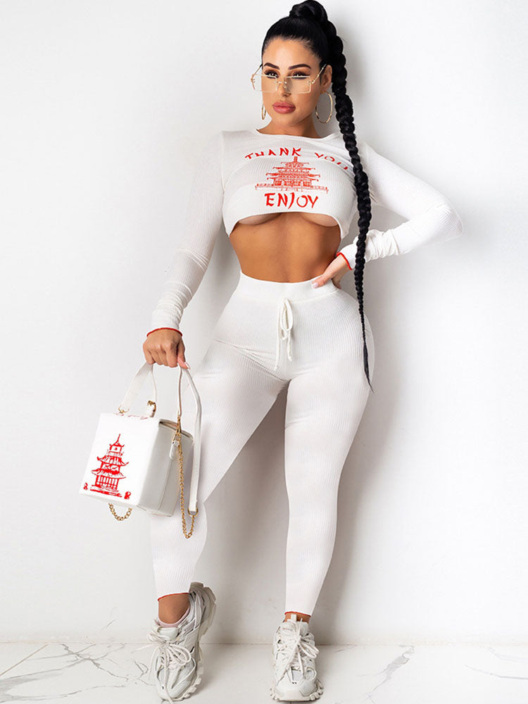 Features:Two-piece outfits. long sleeves. figure print. crop top. drawstring. bodycon long pants.