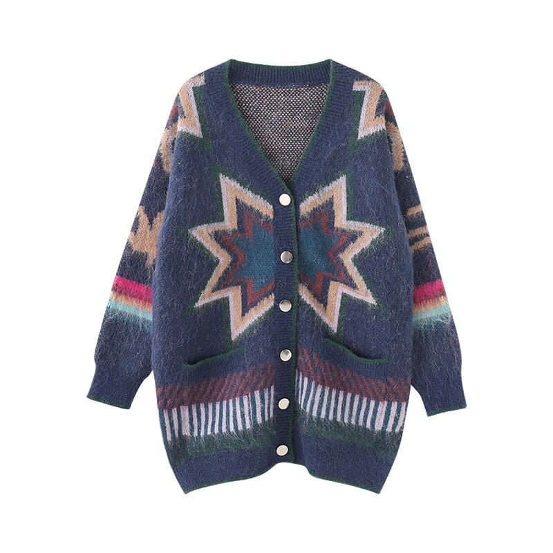 The geometric Mohair Knitted Cardigan is the perfect addition to your boho sweaters collection. The geometric pattern and mohair fabric make this cardigan stand out from the rest. The button placket allows you to adjust the cardigan to your desired fit. Whether you wear it with jeans and a t-shirt or a dress. this cardigan will add a touch of style to any outfit.