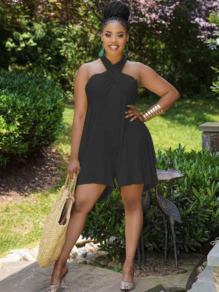 Feature: Halter neck. sleeveless. lace-up. high waist. solid color. loose short pants. one-piece romper.