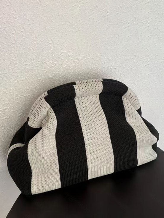 Go out in style with our Knit Stripe Contrast Cloud Bag. With a unique cloud-like shape and vibrant stripe pattern. this charming accessory is both practical and playful.