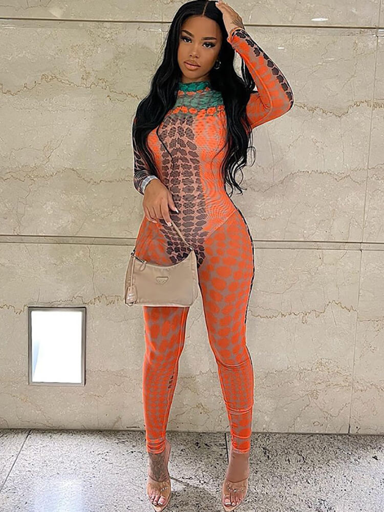 Feature: Snakeskin print. mock neck. long sleeve. color block. zip up. patchwork. bodycon. one-piece jumpsuit.