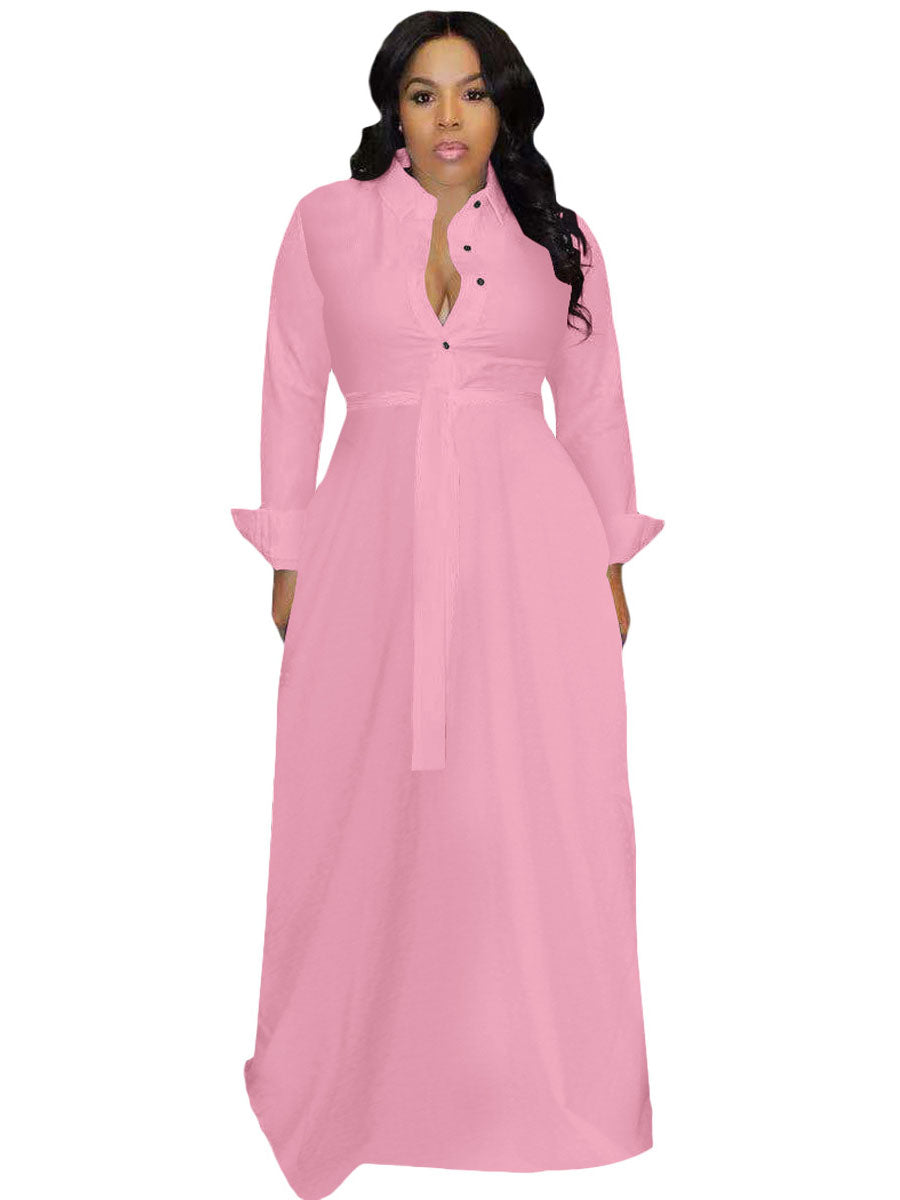 Features:Long sleeve. solid color. collar. button. with a belt. maxi dresses.
