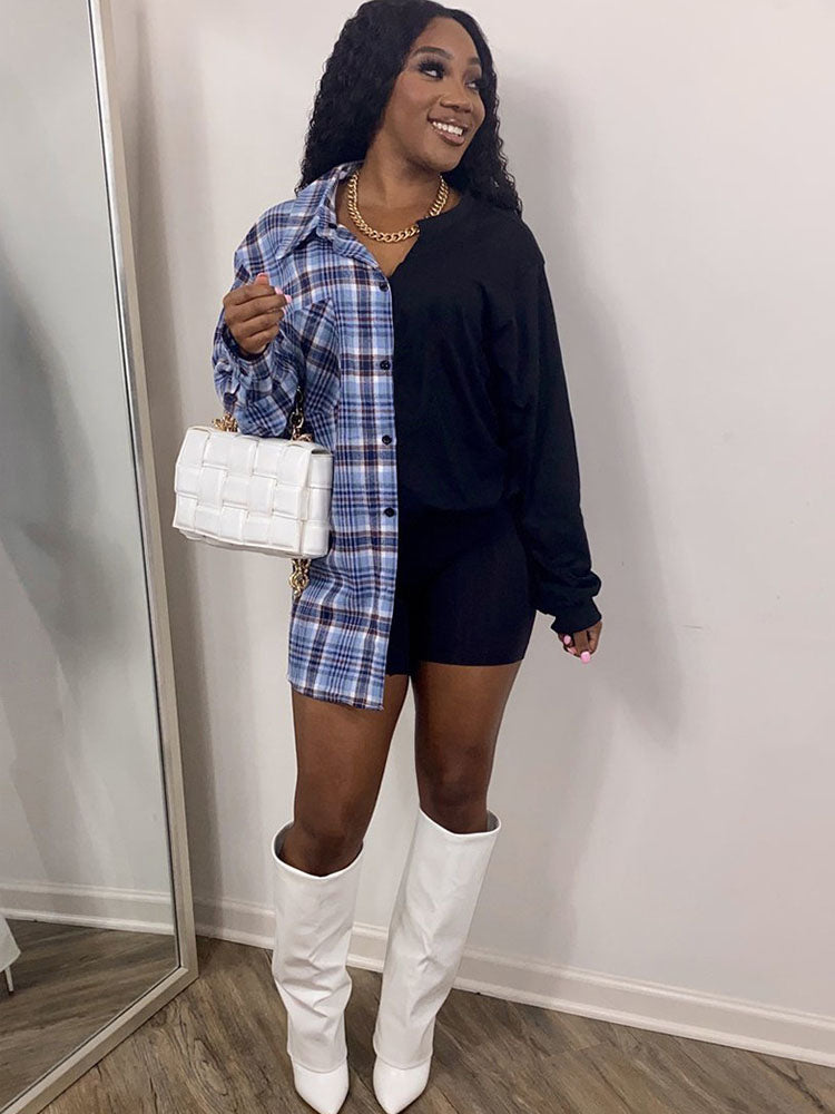 Features: Long sleeves. plaid print. color block. patchwork. button. shirt with a pocket.