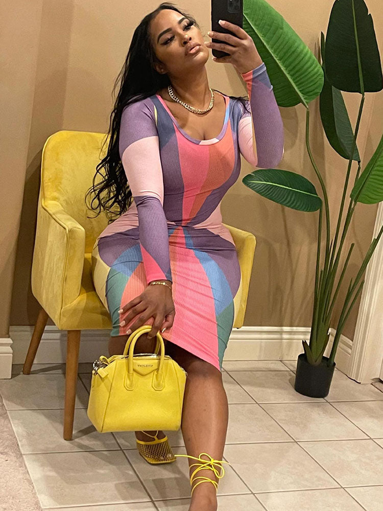 Features: Long sleeve. print. round neck. bodycon midi dress.