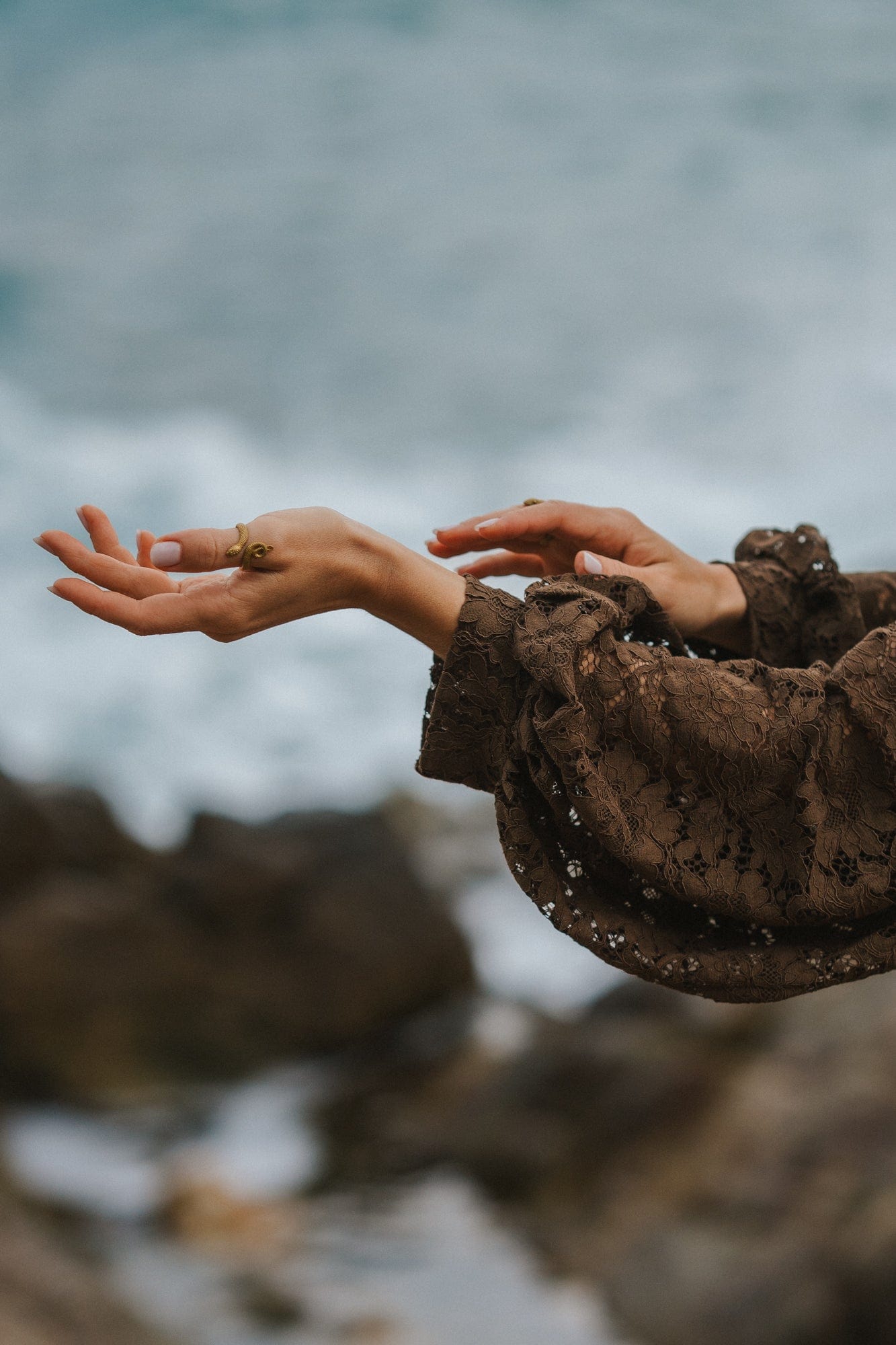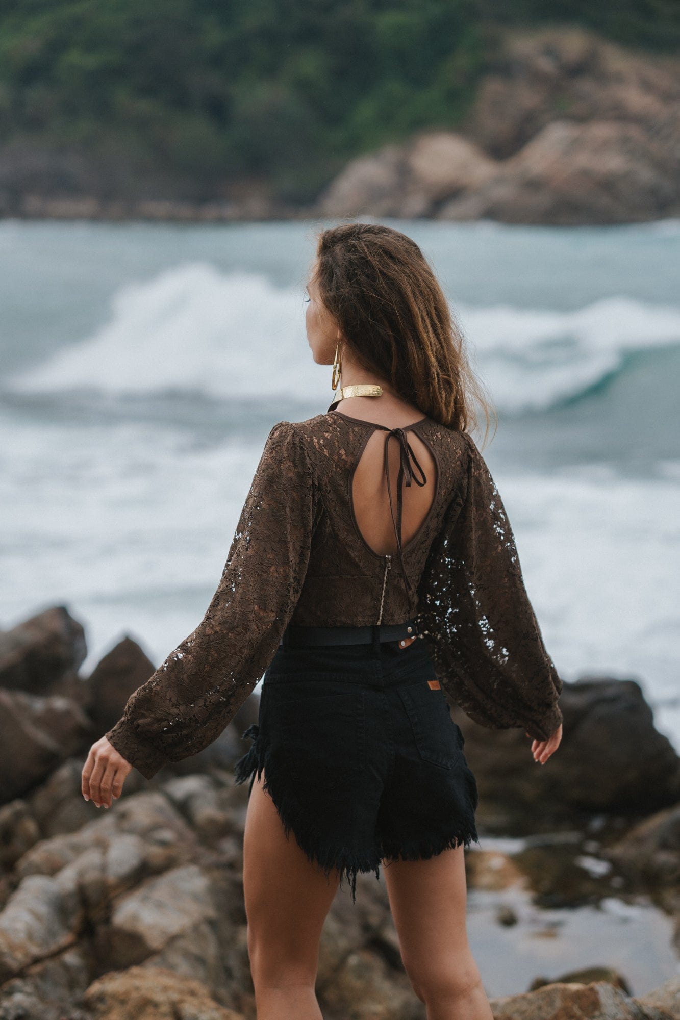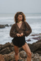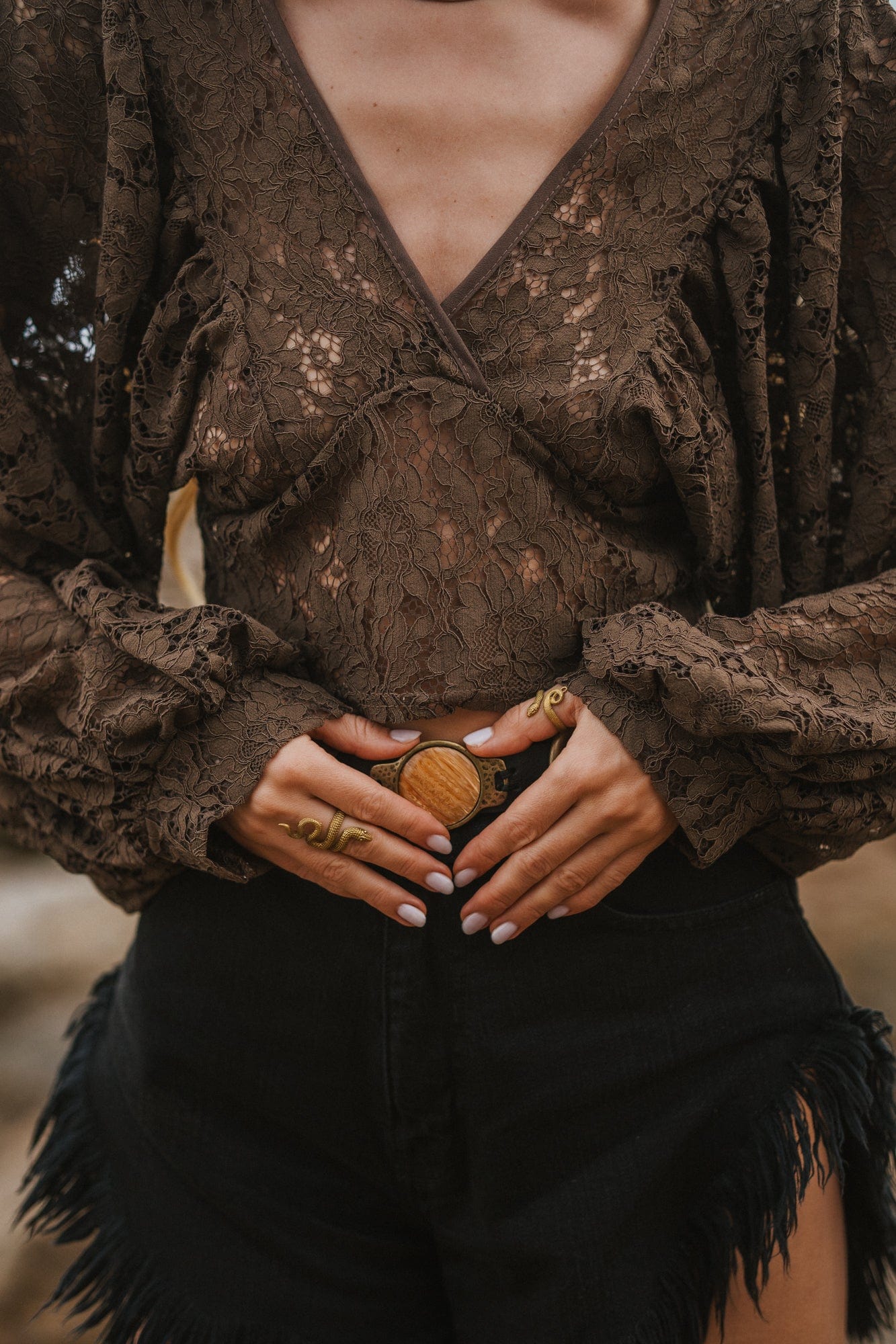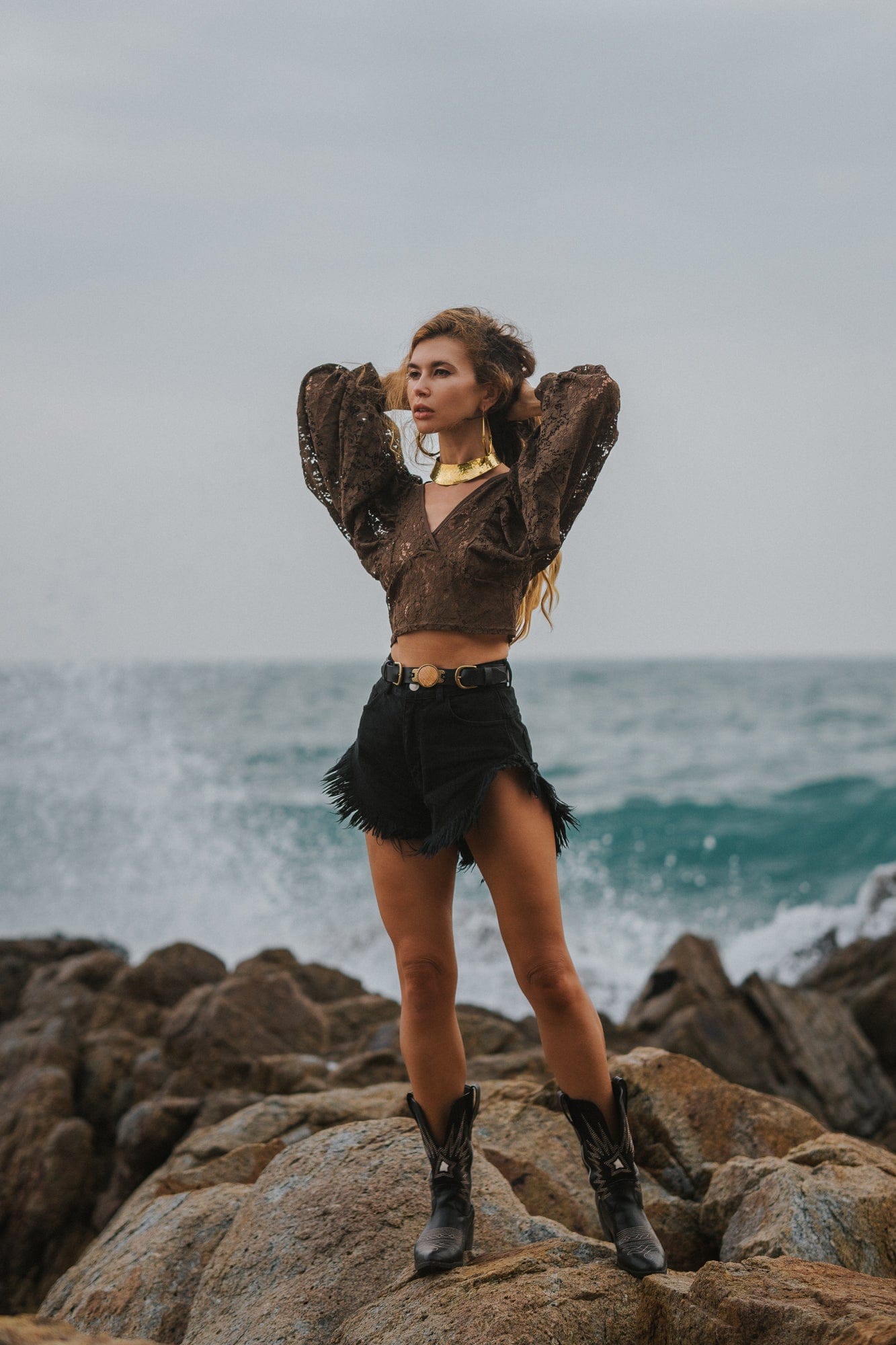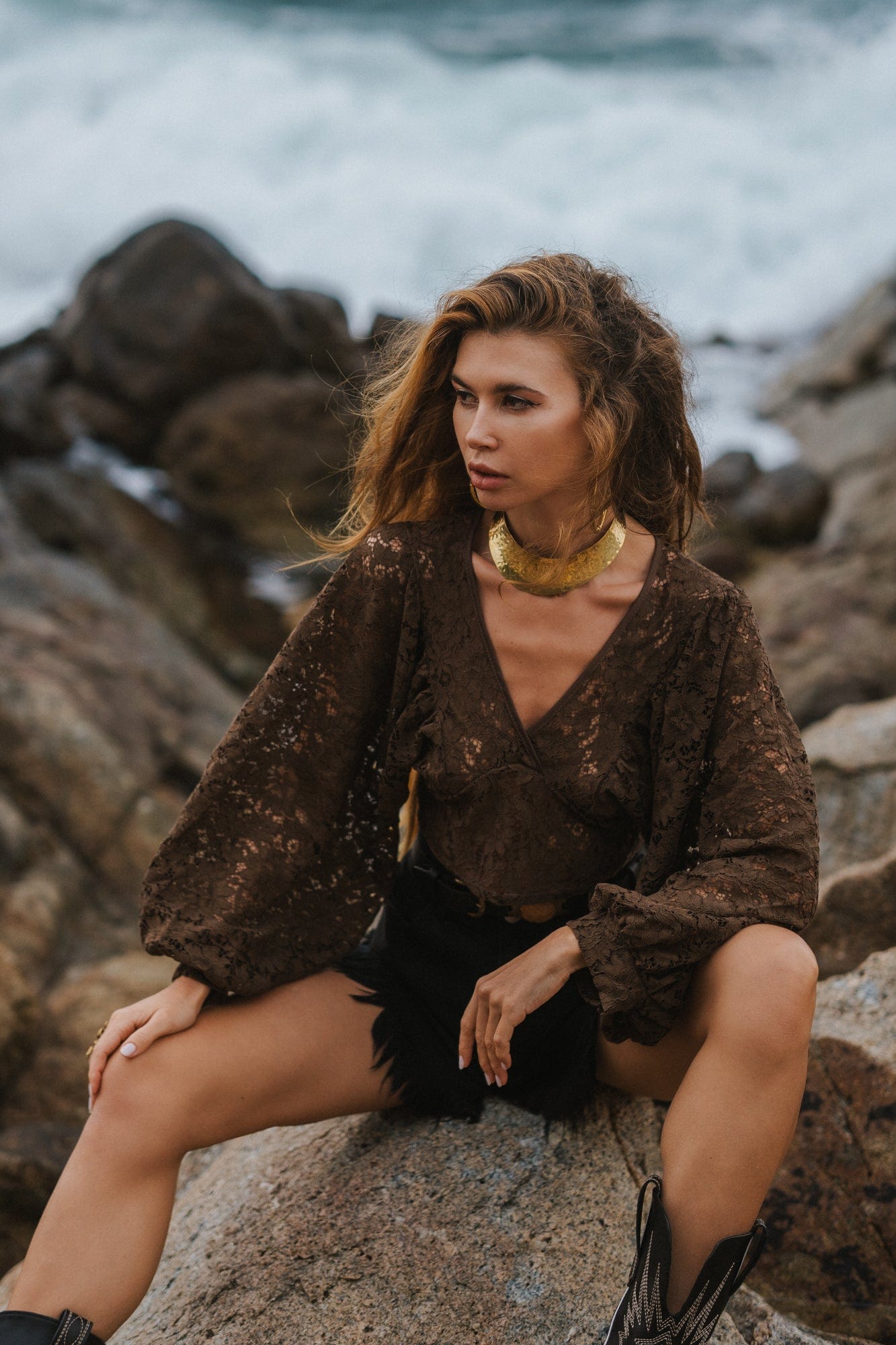 About: Turn heads in this timeless blouse with a v-neckline. exaggerated keyhole cutout. and highly exaggerated sleeves for additional shape in a boho-lace-inspired silhouette.