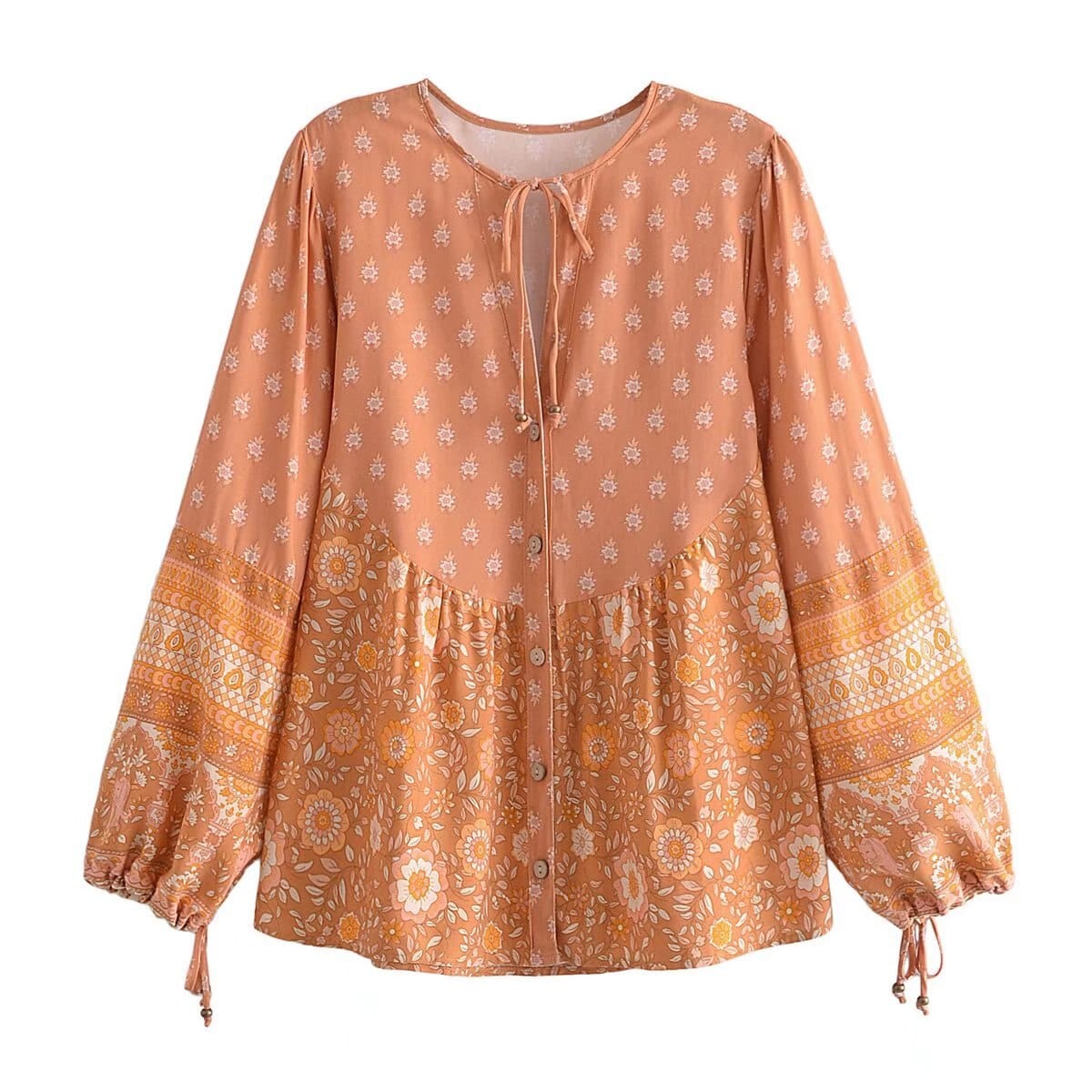Feel beautiful and feminine at your next event in the Mandisa Boho Blouse! This adorable piece features a vibrant bohemian print in 2 colors. billowed long sleeves with tassel ties. and a v-neckline with tassel ties.
