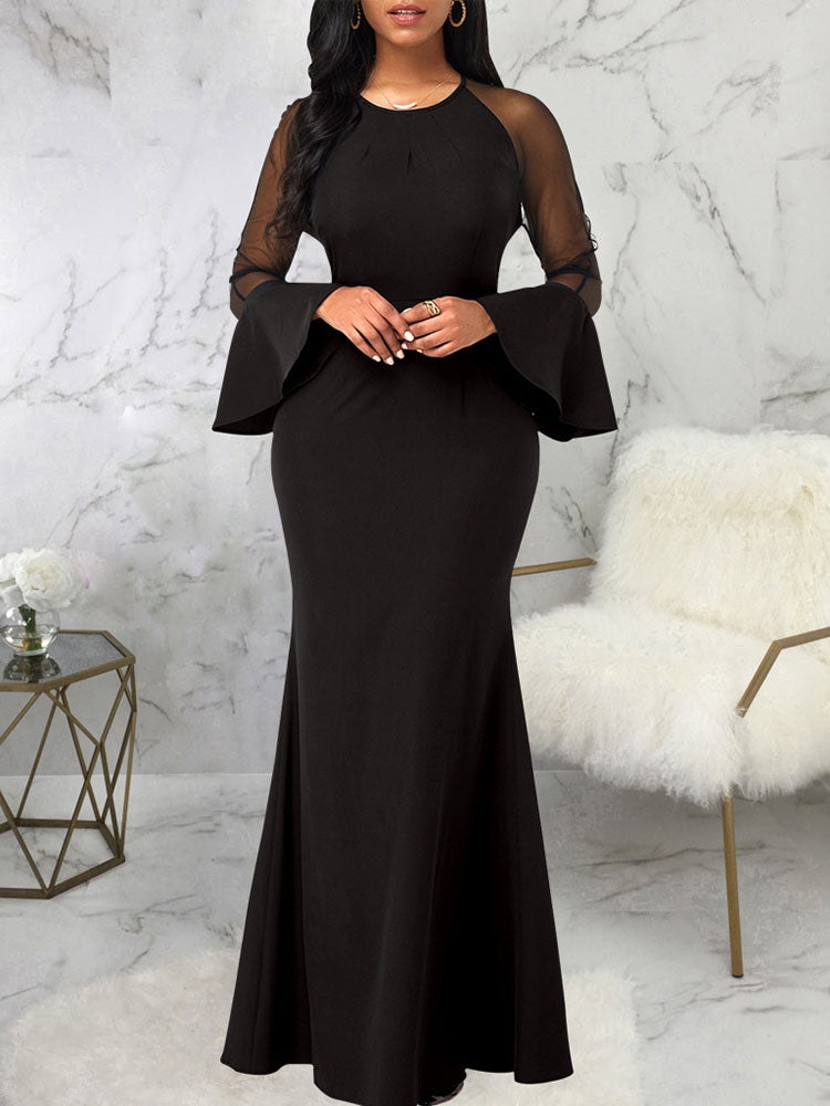 Features: Sheer mesh. long sleeves. bell sleeves. solid color. patchwork. fishtail. floor-length. bodycon maxi dress.