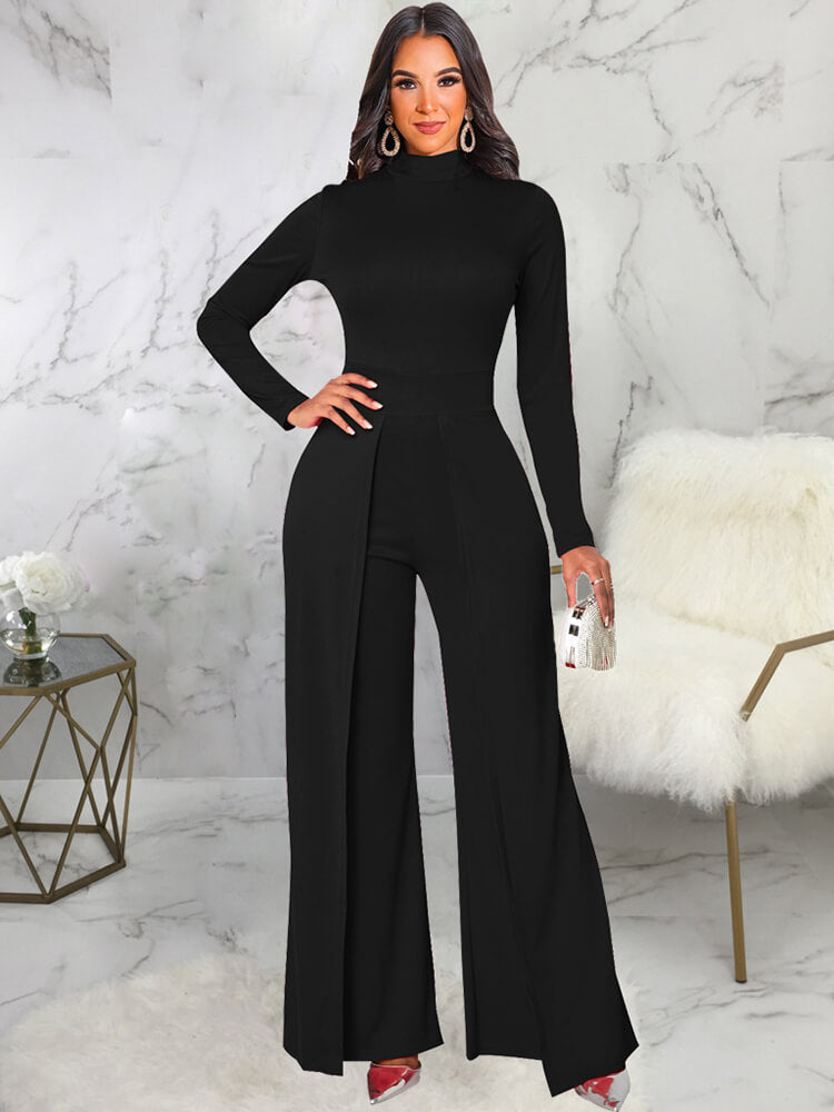 Features: Mock neck. long sleeve. bodycon. wide leg. solid color. high waist. jumpsuits.