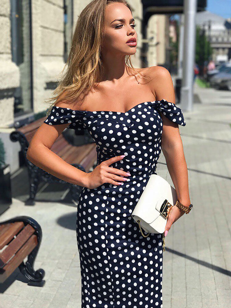 Features:High waist. bodycon. sleeveless. backless. off-shoulder.polka dot. v-neck. sexy. midi dresses.