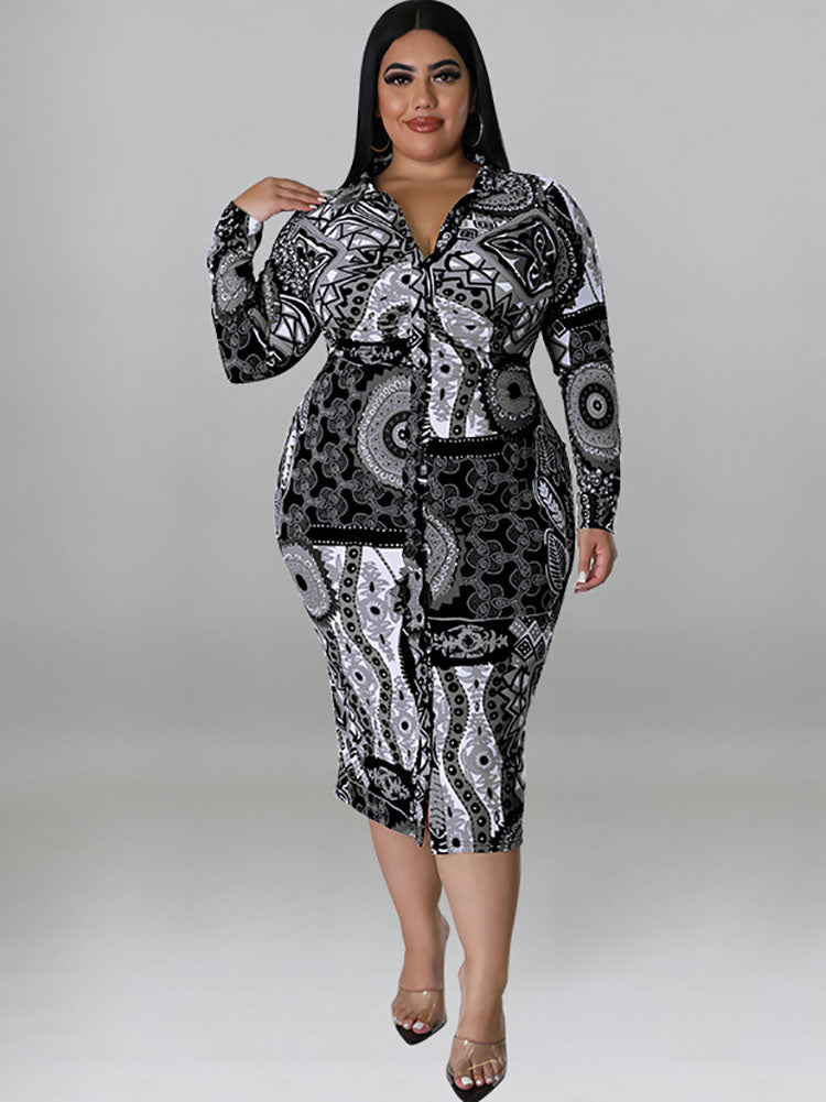 Feature: Plus size. long sleeves. v-neck. button. print. bodycon shirt midi dresses.