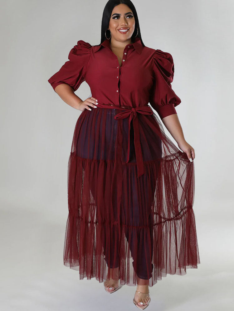 Features: Plus size. long sleeve. v-neck. patchwork. button. mesh. ruffle. ruched. lace-up. cover-up. see-through.