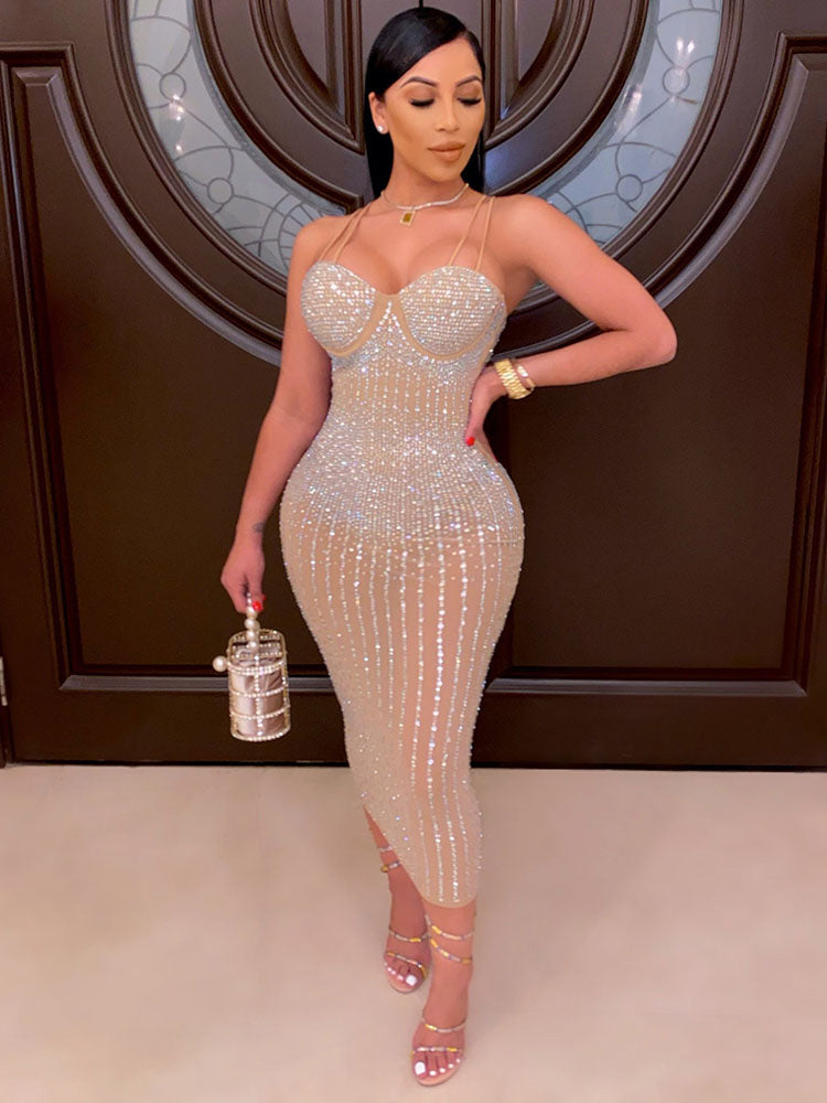 Features:Sleeveless. rhinestone. see-through. sexy. spaghetti strap. midi dresses.