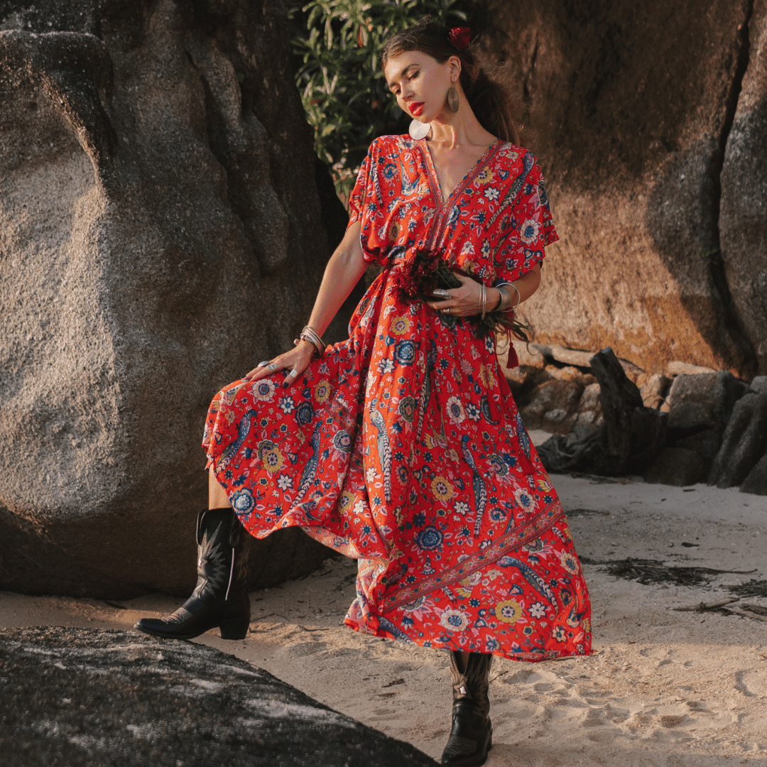 • Features v-neck at front and deep V at back with tassel tie across back shoulders