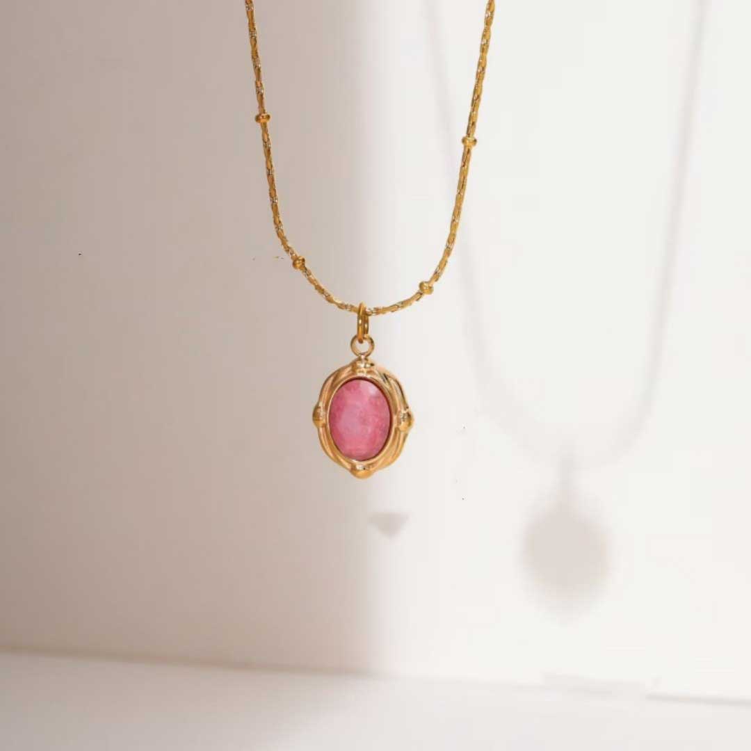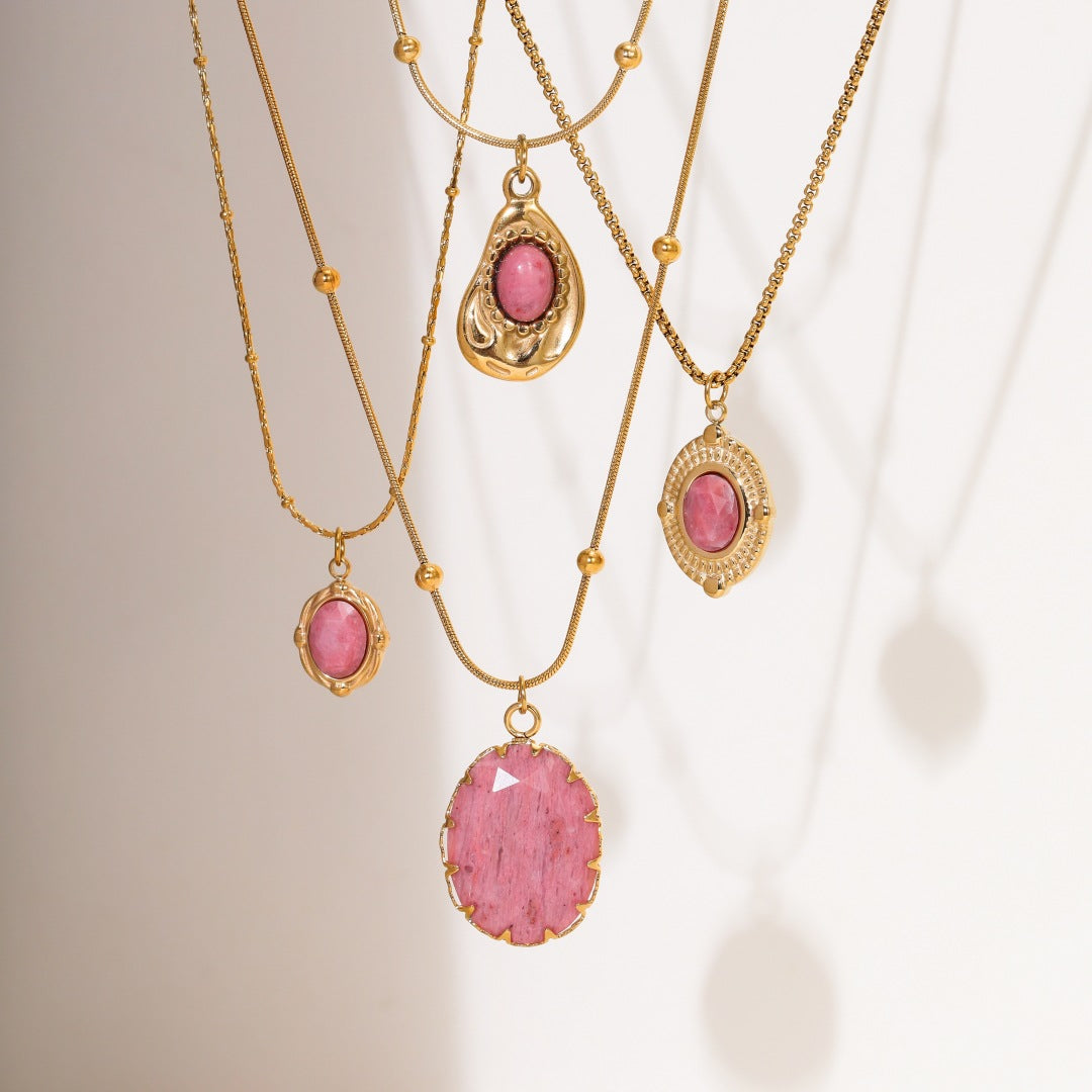 The Rhodochrosite 18K Gold Necklace is serving soft romance with a vintage twist—featuring layered gold chains and dreamy rose-toned stones that catch the light just right. Perfect for adding a hint of heirloom energy to your modern-day fits. Wear it solo for subtle elegance or stack it up and let your inner romantic take center stage.