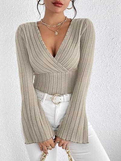 This stylish top features ribbed fabric and flare sleeves for a trendy. flattering fit. Slightly stretchy for comfort. it's perfect for casual or layered looks.