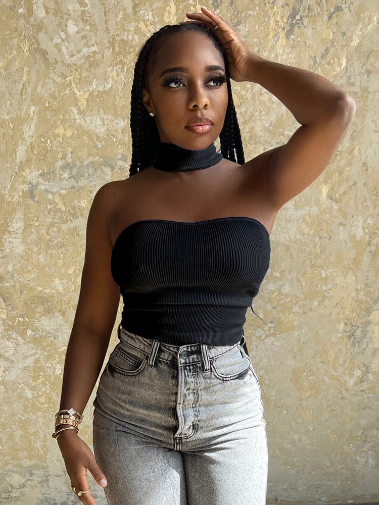Features:Sleeveless. ribbed knit. halter. backless. solid color. crop top.
