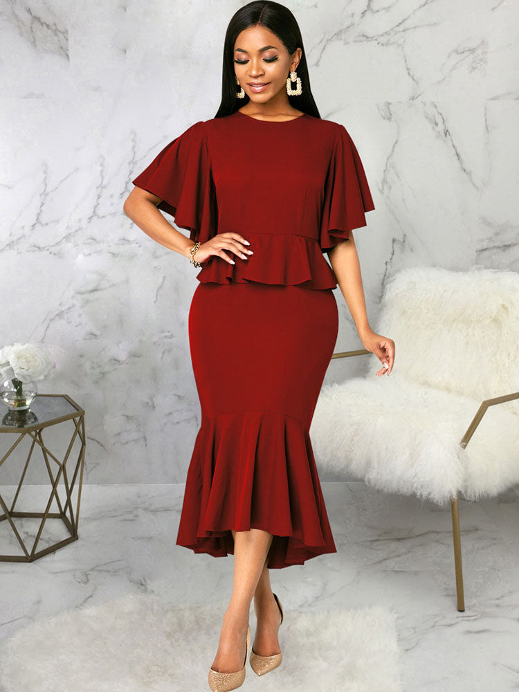 Feature: Solid color. ruffle. peplum hem. knee length. zipper back. elegant. half sleeve. short sleeve. round neck. bodycon. midi dresses.