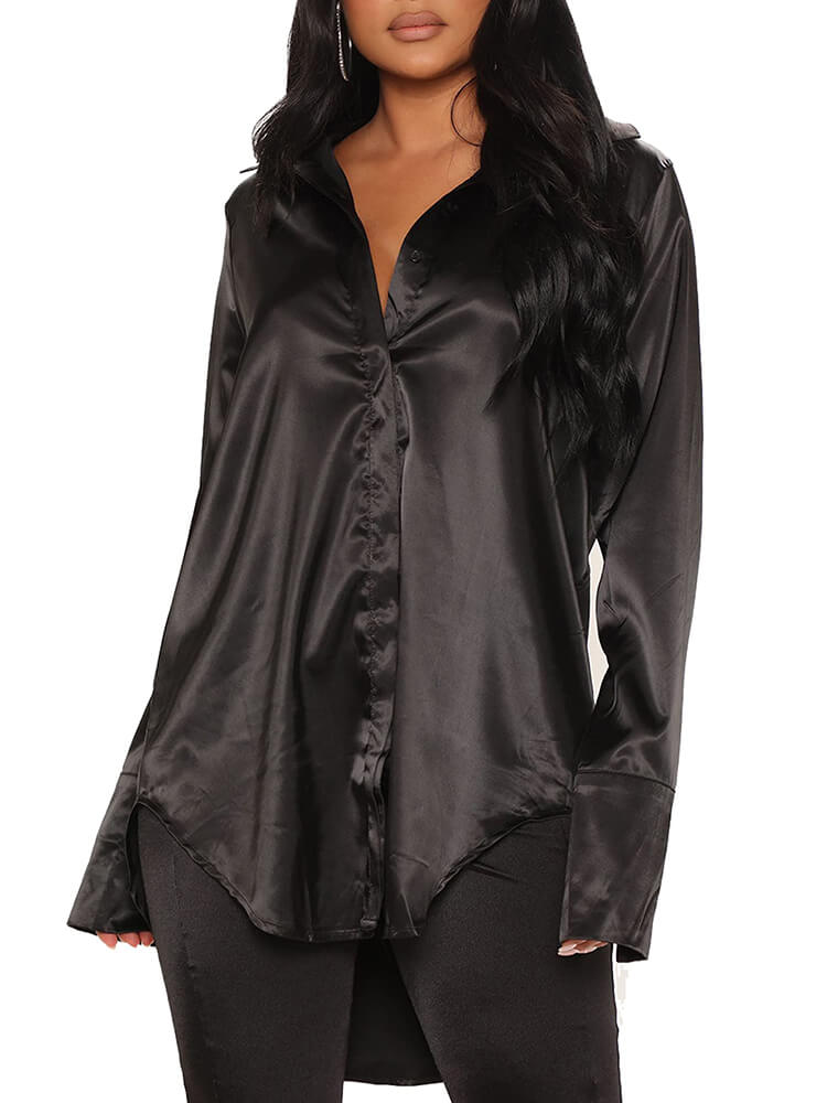 Features:Satin. long sleeve. solid color. button-down. asymmetrical hem. loose. blouses.
