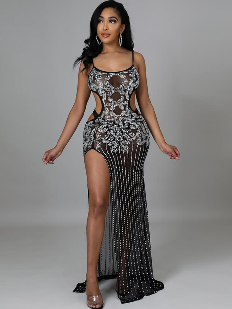 Features:Maxi dresses. Spaghetti Strap. Sleeveless. Split. slim fit. hot drill. rhinestone. glitter. cut out. backless. mesh. see-through.