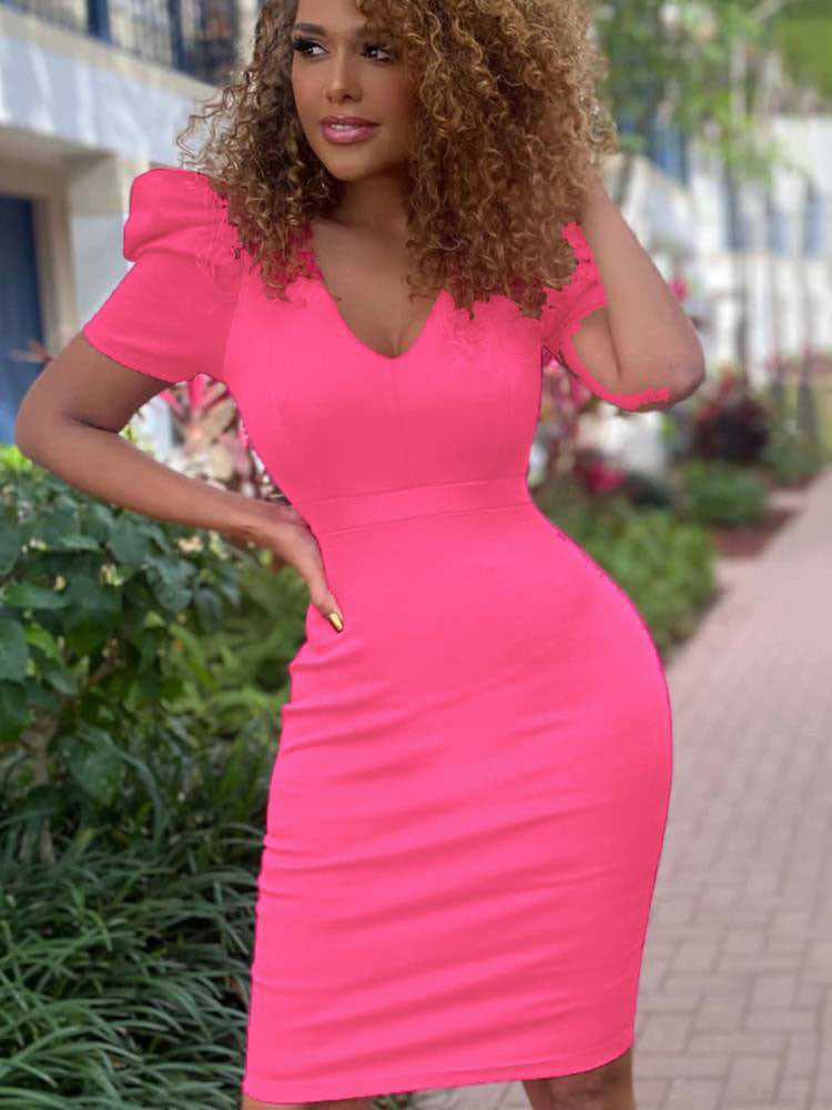 Features: Short puff sleeve. v-neck. solid color. back zipper. bodycon midi dresses.
