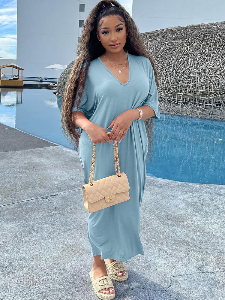 Features: Short sleeve. loose. solid color. v neck. sexy. maxi dress. simple. This dress makes you fashionable. sexy. and charming.