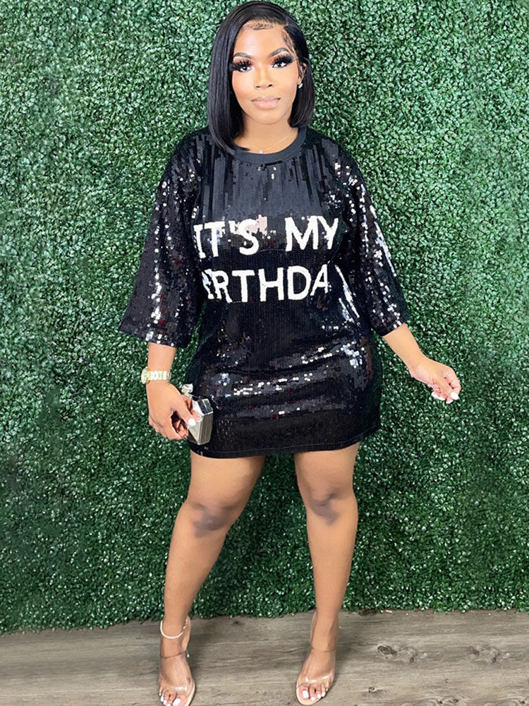 Features:Short sleeves. sequins. round neck. print. loose mini dress.