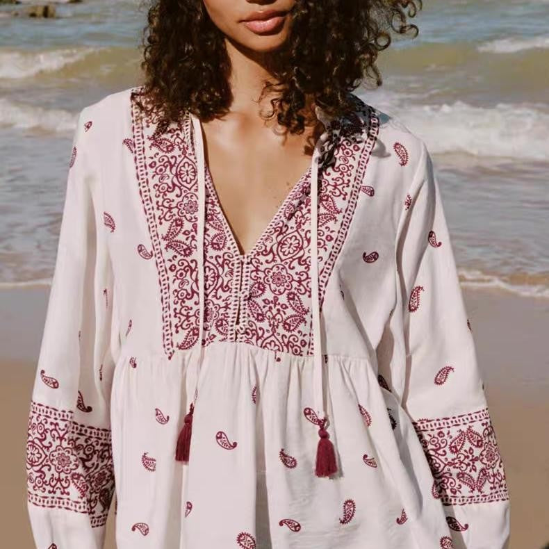 Float through golden hours in the Sienna Boho Tassel Blouse �a breezy essential with vintage-inspired embroidery and playful tassel ties. The relaxed silhouette pairs perfectly with your go-to denim or layered over a bikini for that sun-drenched beach-to-bonfire energy. Total main character vibes. no effort required.