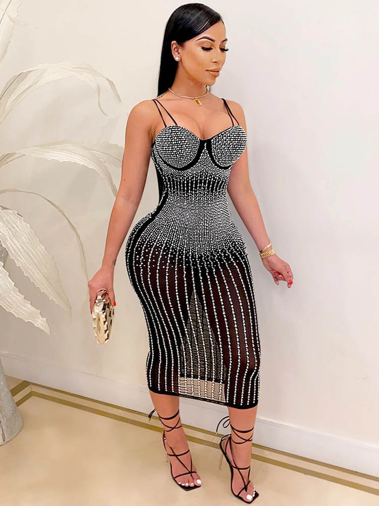 Features: Sexy hot process drilling. pencil bodycon design. spaghetti strap. sheer mesh. see-through. rhinestone. wrap chest. elastic shoulder straps. back zipper. sexy bodycon party midi dress.