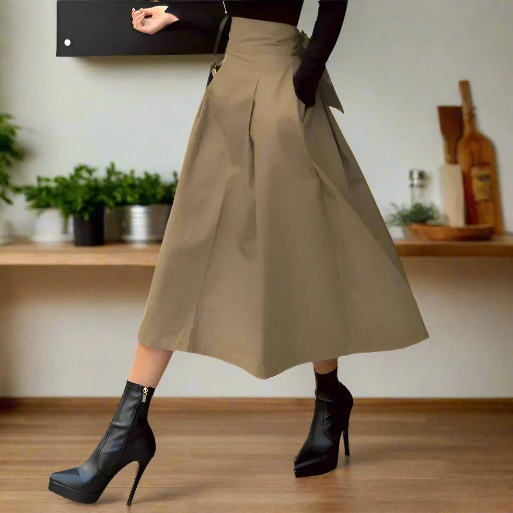 Add a touch of elegance to your wardrobe with our Sophisticated High-Waist Bow Accent Fitted Skirt. Made from a luxurious blend of cotton and polyester. this skirt boasts a flattering empire waistline and a slim fit silhouette. The ankle-length design and lace-up decoration add a touch of sophistication to this casual piece.