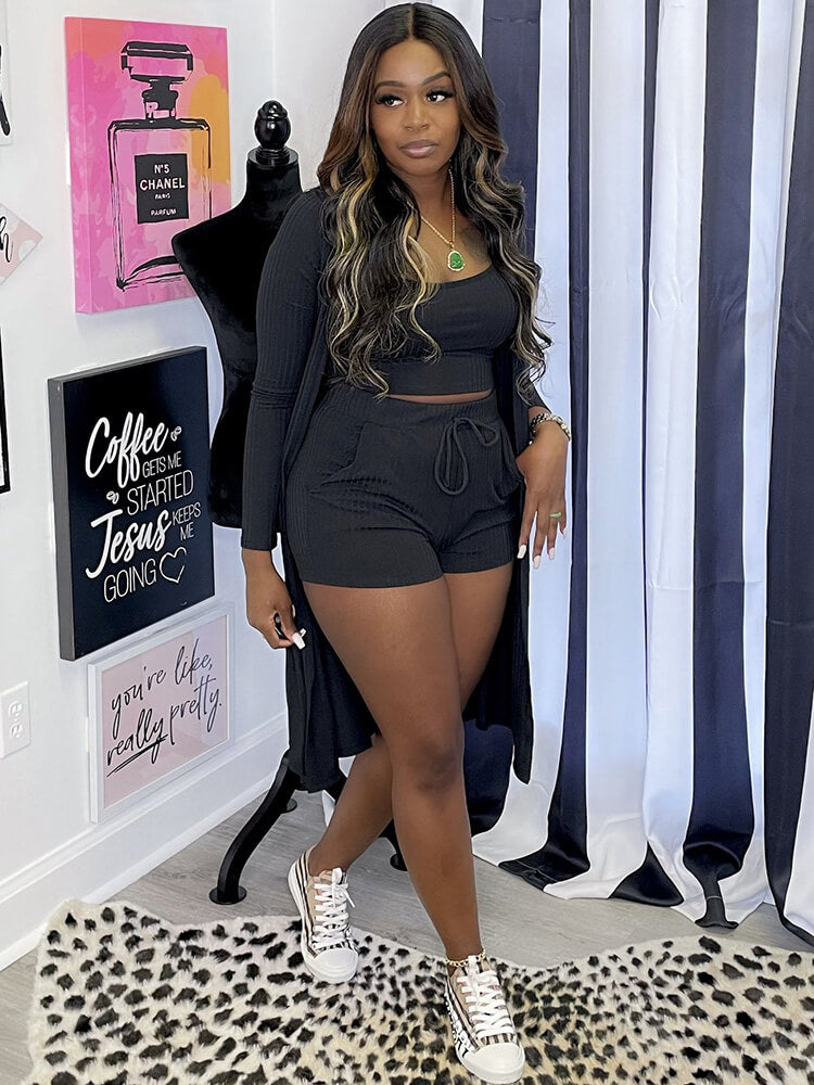 Features: Three-piece tracksuits. solid color. ribbed. knitted. crop tank top. long sleeve. outwear and shorts set. front cardigan coat coverup. round neck sleeveless crop vest top. high waist shorts. which is simple but stylish. is full of energy and Sportiness.