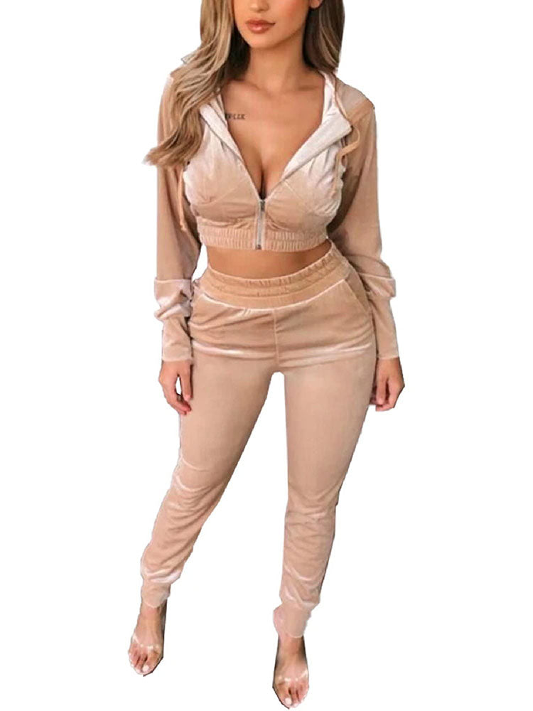 Features:Long sleeve. velvet. crop top. hoodie. solid color. long pants. two-piece outfits.