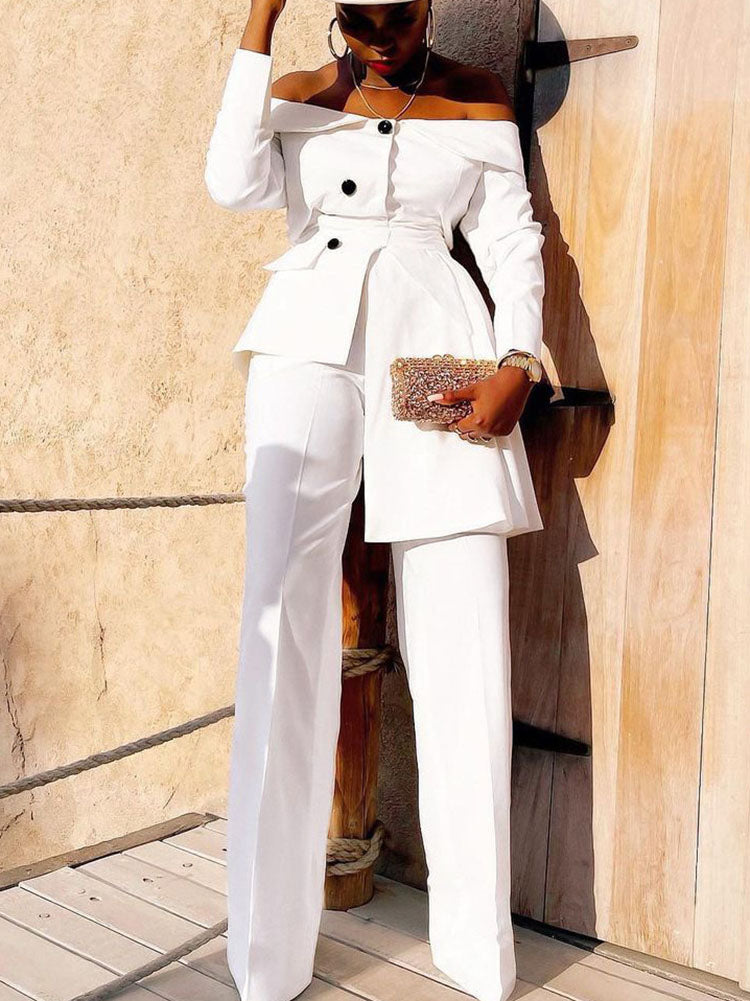 Features: Two-piece outfits. off-shoulder. long sleeves. button. regular and neat blazer asymmetrical hem. floor-length. wide-leg pants.