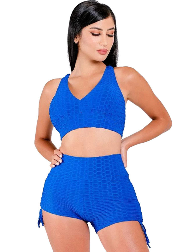 Features:Two-piece outfits. jacquard weave. sleeveless. backless. crisscross. crop top. solid color. high waist. drawstring. short pants.
