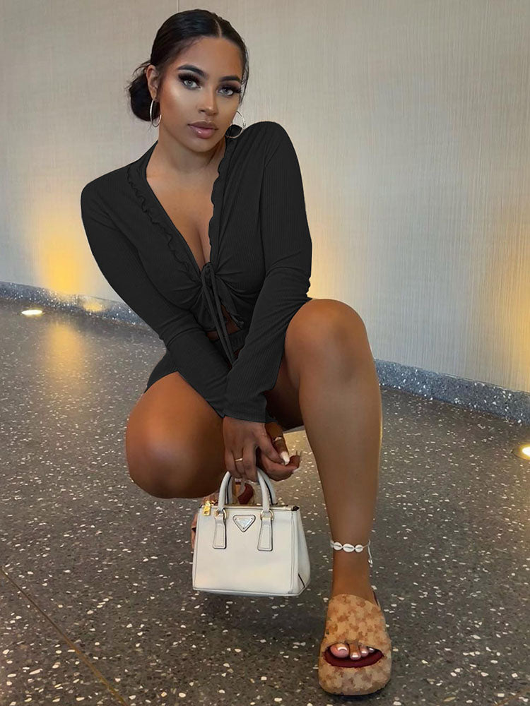 Features: Long sleeves. v-neck. tie-up. solid color. high waist. bodycon mini skirts. two-piece outfits.