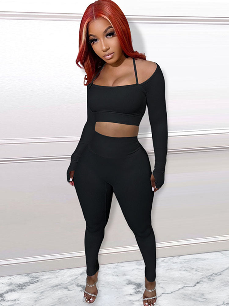 Features:Long sleeve. solid color. crop top. halter. off-shoulder. bodycon. high waist. long pants.