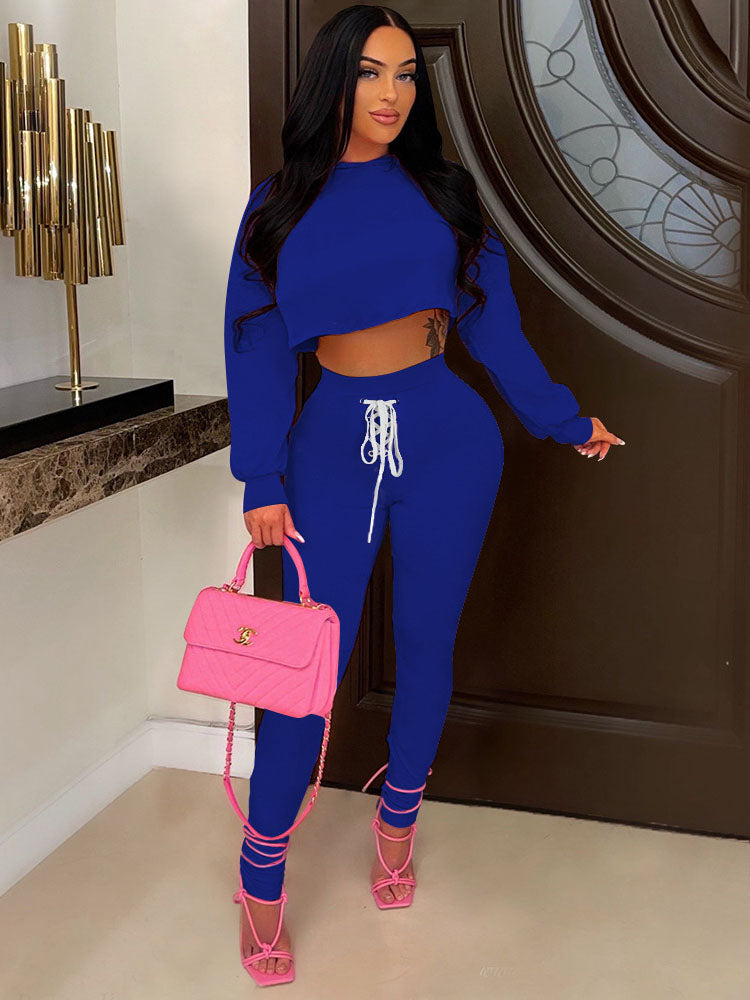 Features:Two-piece outfits. long sleeves. solid color. crop top. drawstring. skinny pants.
