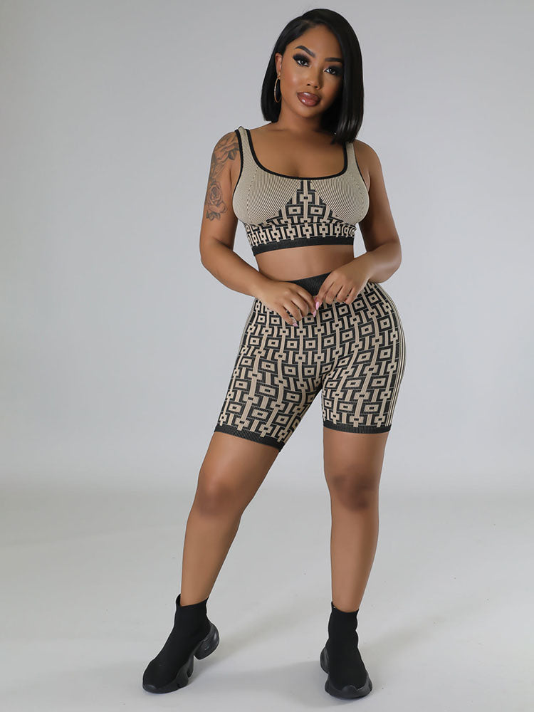 Features:Sleeveless. crop top. tank top. figure print. bodycon. shorts. two-piece outfits.