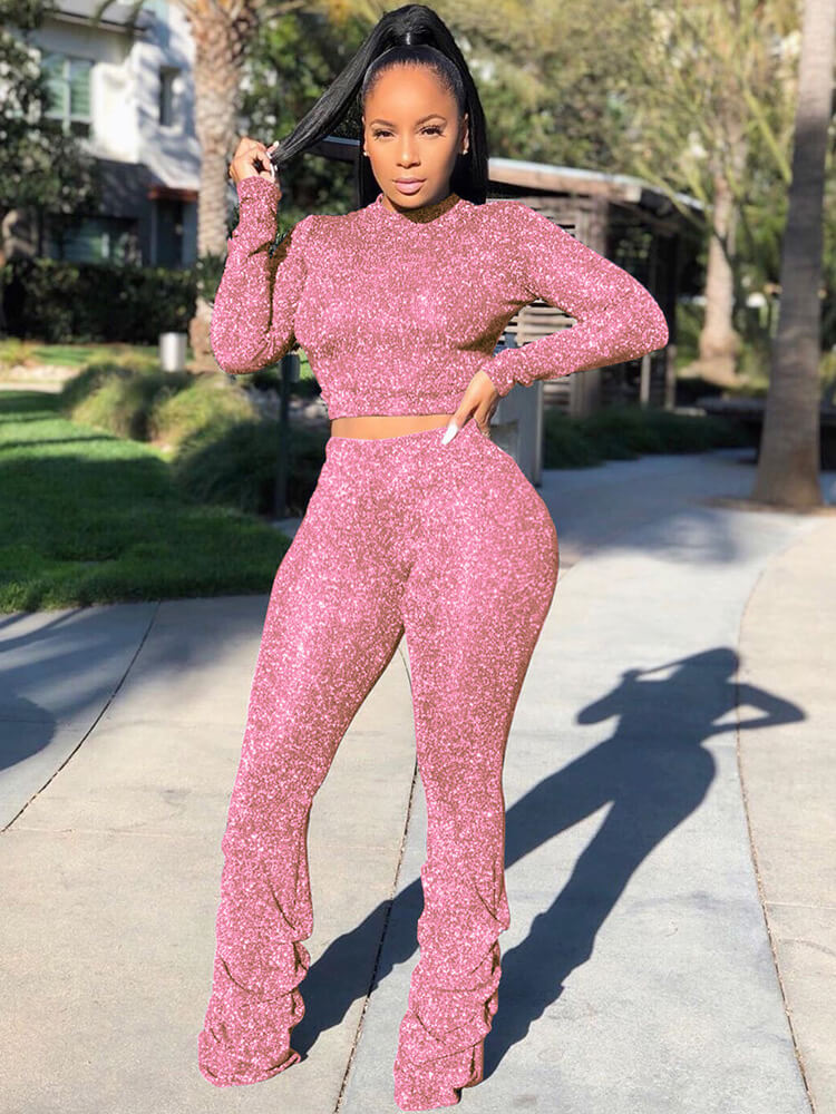 Two Piece Glitter Bodycon Crop Top + Stacked Pants