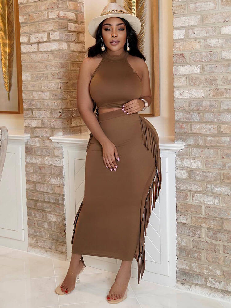Two Piece Halter Tassel Round Neck Skrit Suits