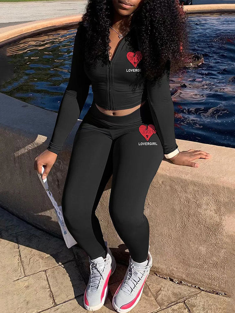 Features:Two-piece outfits. long sleeves. zipper. heart print. crop top. skinny long pants.