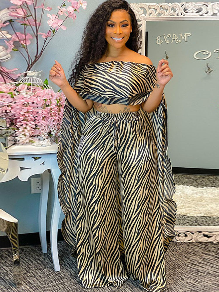 Features: Two-piece outfits. off-shoulder. long cloak. tigerprint. elastic waist. high waist. drawstring. floor-length. wide-leg pants.