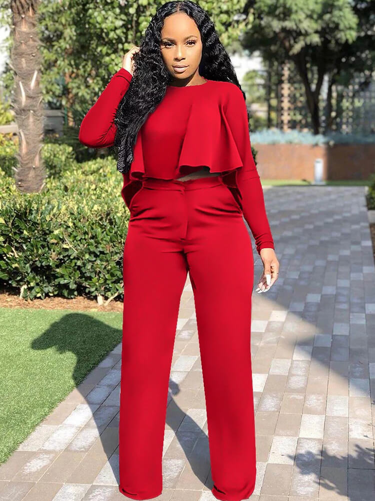 Feature: Ruffle. long sleeve. solid color. crop top. bodycon. pants suit. two piece outfits.