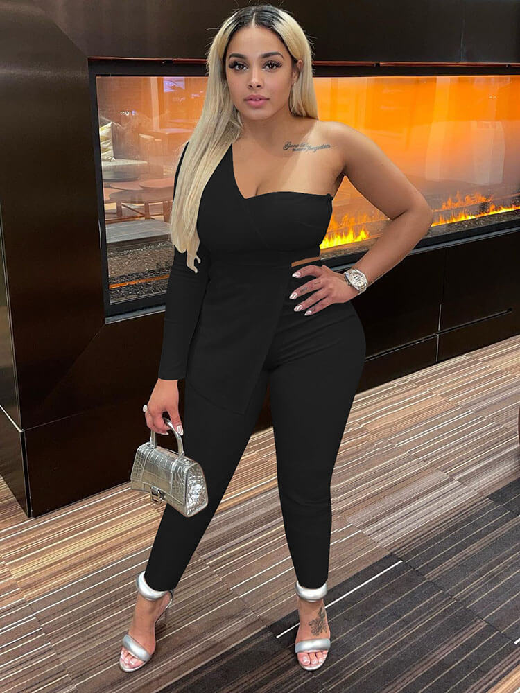 Features: Solid color. one shoulder. backless. bodycon. slim. asymmetrical. long pants. two-piece outfits.
