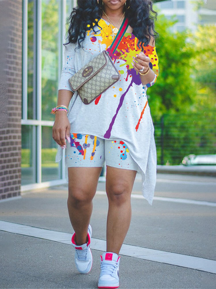 Features: Two-piece outfits. one-shoulder. short sleeves. batwing sleeve. tie-dyed print. asymmetrical hem. flowy long T-shirt. bodycon shorts.