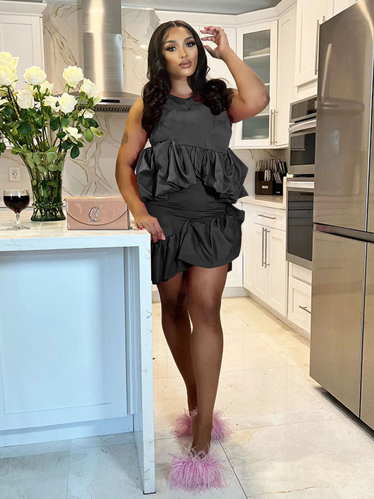 Features:Sleeveless. crop top. ruffle. solid color. mini skirt. two-piece outfits.