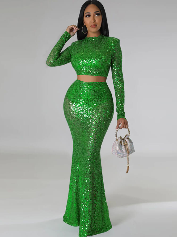 Feature: Sequin. see-through. sheer. mock neck. patchwork. bodycon. long sleeve. solid color. maxi skirt. crop top. two-piece skirt suits.
