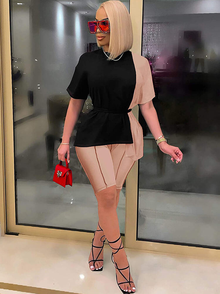 Feature: Round neck. short sleeve patchwork oversize t-shirt top with Irregular hem and belt. High waisted slim fit pants with vertical stripes. color block.