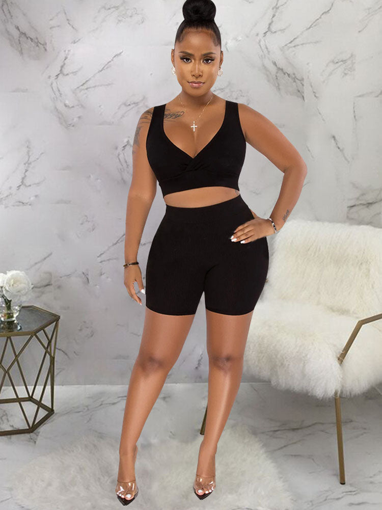 Features:Two-piece outfits. sleeveless. solid color. tank top. crop top. short pants.