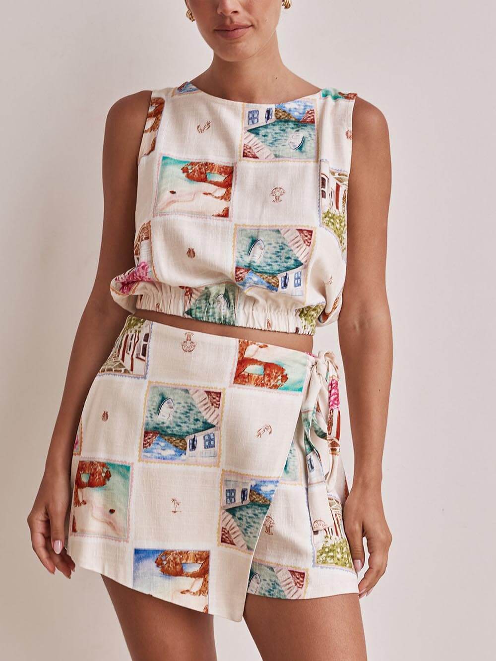 Be stylish and comfortable in our unique printed tank top and tie skirt set.