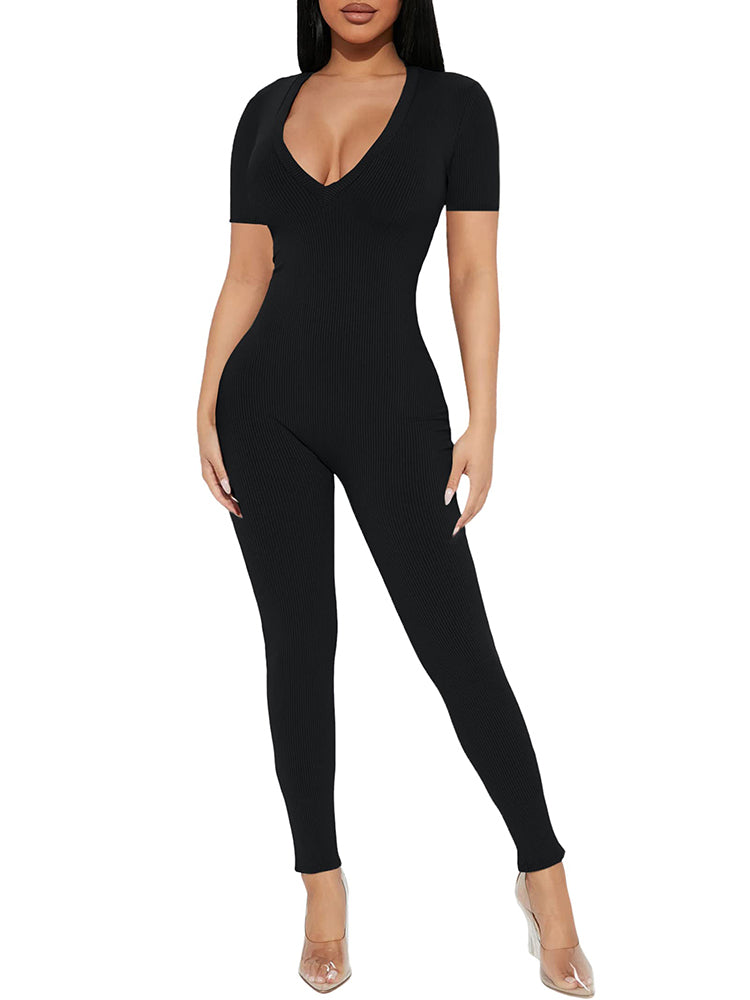 Features:V-neck. stretchy. short sleeve. ribbed. solid color. long pants. jumpsuits.